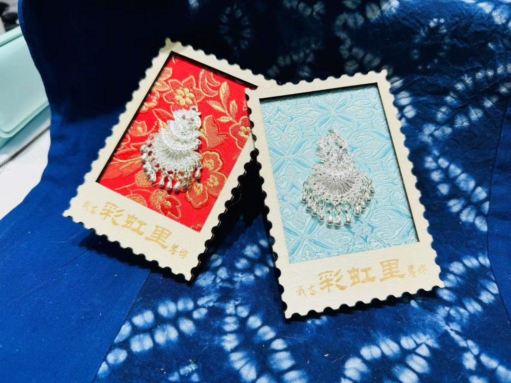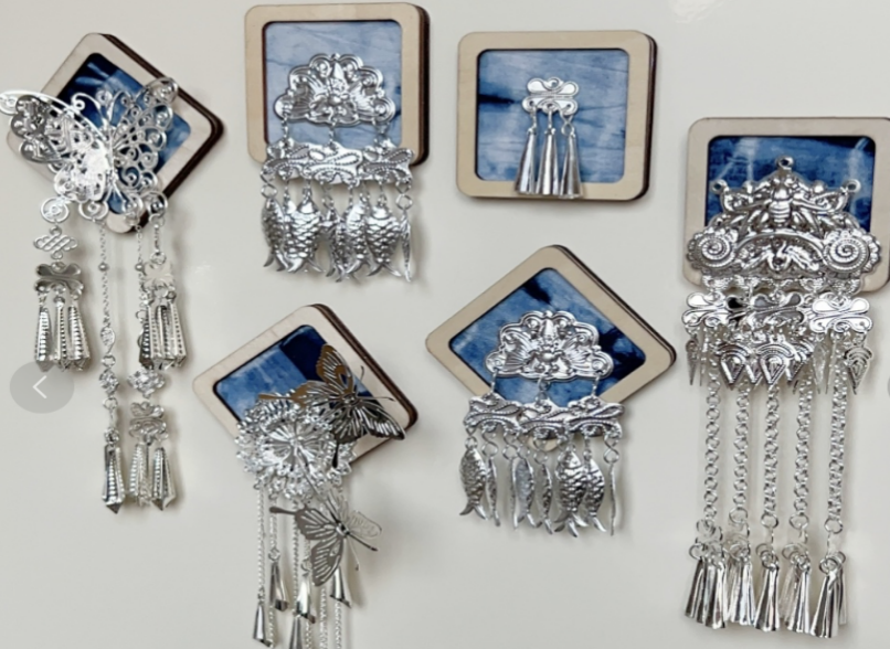 当苗银的璀璨邂逅扎染的斑斓,再经由残疾人匠人的巧手雕琢,便诞生了这款独具魅力的苗银扎染冰箱贴。