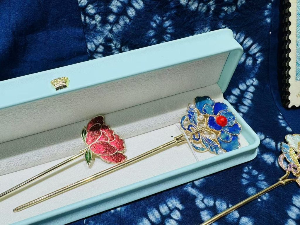 点翠工艺,曾是宫廷贵族专属,以翠鸟羽毛的灵动之色,勾勒出华美纹样。残疾人匠人怀着对传统文化的敬畏与热爱,克服身体不便,精心挑选每一片羽毛,细致裁剪、粘贴,让发簪上的花鸟、祥云等图案栩栩如生,仿佛将盛唐的繁华与浪漫凝固其中。